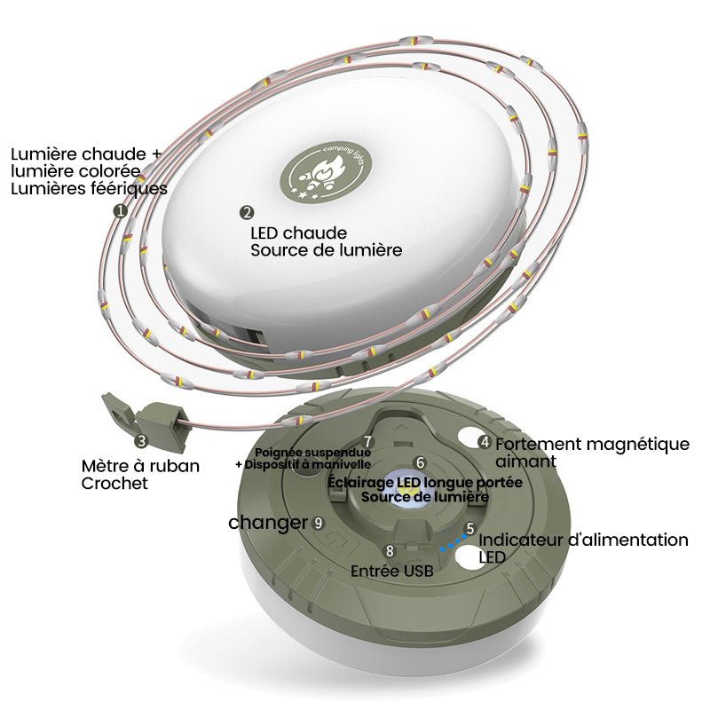 • ◪ Ajoutez de la chaleur: illuminez vos aventures en plein air et ajoutez de la chaleur à vos nuits avec ces guirlandes lumineuses pour tente. Ils peuvent éclairer votre tente, créer une atmosphère chaleureuse et combiner des lumières de camping et des guirlandes lumineuses d'ambiance dans une unité compacte.