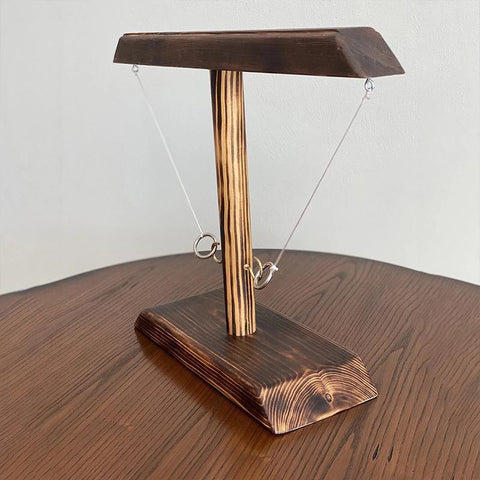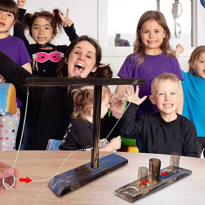 - Placez une tasse en bois dans le cercle central, prenez les anneaux et c'est parti ! Chaque fois que vous posez le crochet, déplacez la coupe en bois d'une case vers votre adversaire. Le joueur gagne lorsque la coupe en bois quitte l'extrémité de l'échelle.