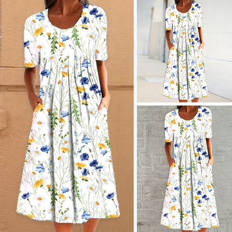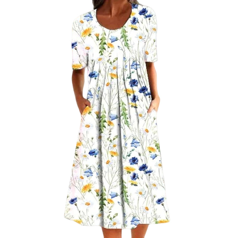 Frais du style jardin! Cette magnifique robe d'été à imprimé floral bleu et jaune présente un joli imprimé de jardin fleuri et un fond blanc, donnant à cette élégante robe midi à manches courtes une combinaison de couleurs édifiante.