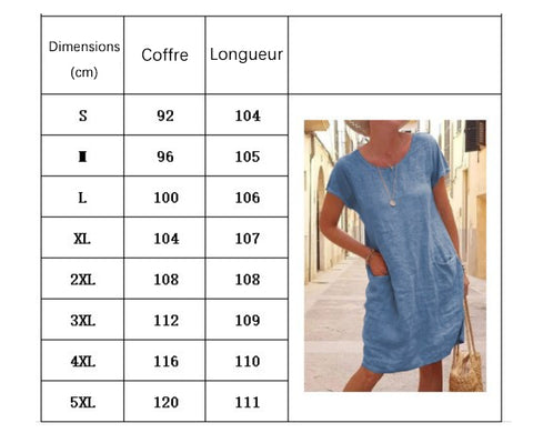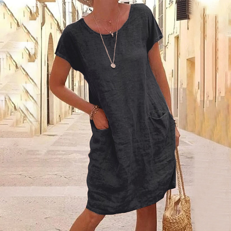 Design : col rond/coupe ample/couleur unie/manches courtes/jupe/robe/avec poches.