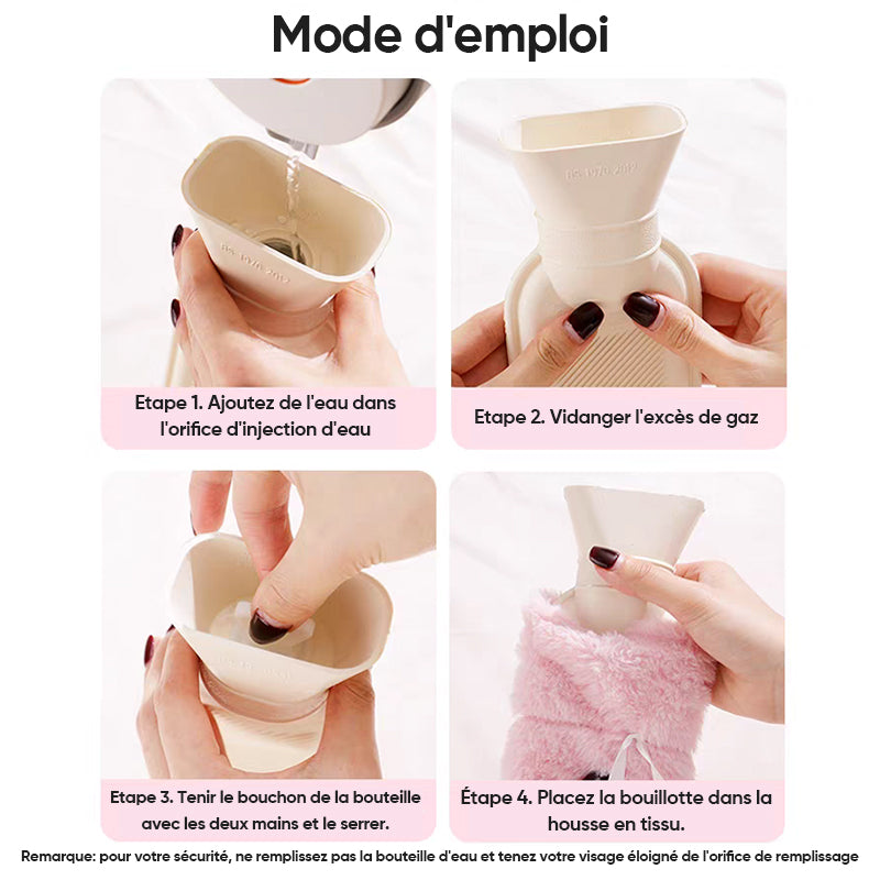 Utilisations polyvalentes de la bouillotte: Cette bouillotte peut être utilisée pour réchauffer les mains, les pieds, les épaules, l'abdomen et la taille, ou pour réchauffer le lit.