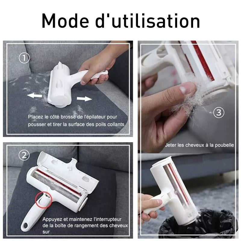 FAIRE DISPARAÎTRE LES POILS ANIMAUX DE LAMAISON: Vêtements,canapés, literie, tapis, couvertures, planche ou sièges de course; Débarrassez-vous de tous vos poils d’animaux de compagnie (chats, chiens, lapins) grâce à la nouvelle brosse Roller. Utilisez un chiffon humide pour essuyer après chaque utilisation. Ne nettoyez pas la surface de la brosse directement avec de l'eau.