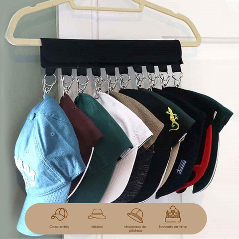 Super facile à utiliser: 1. Enroulez cet organiseur de casquettes sur votre cintre et fixez le velcro. 2. Clipsez vos 10 bouchons.