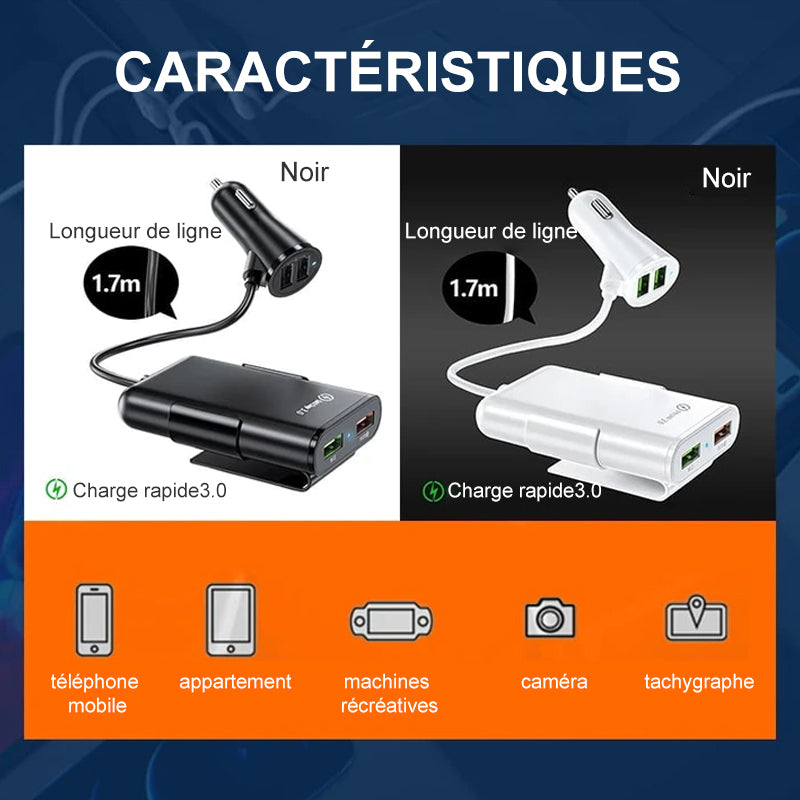 4 ports USB intelligents peuvent identifier rapidement et facilement vos téléphones portables, tablettes et autres appareils électroniques pour fournir la meilleure efficacité de charge. -