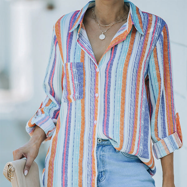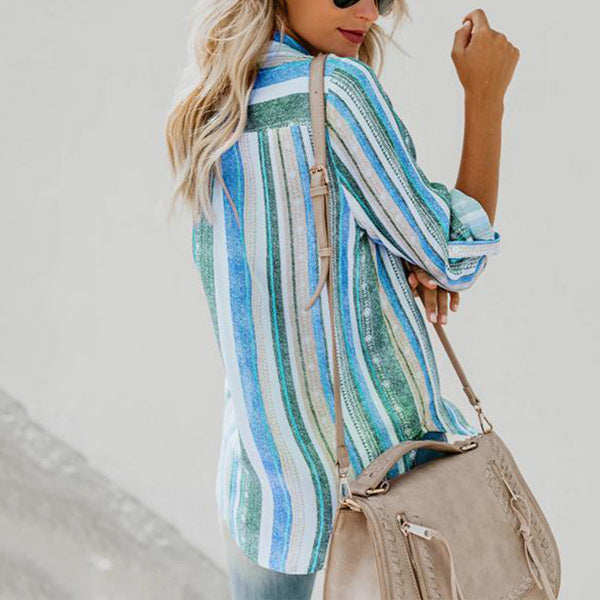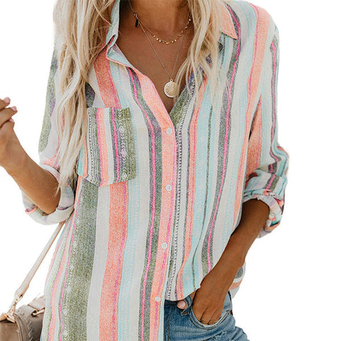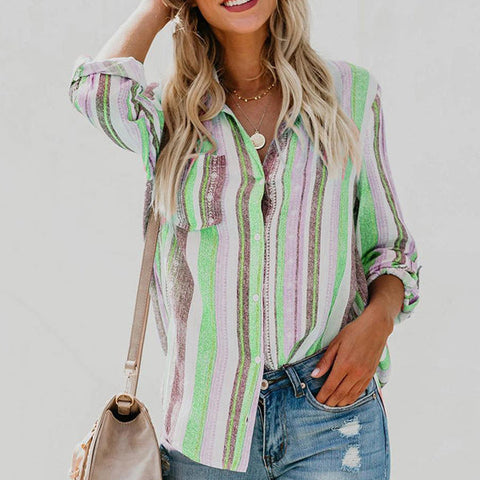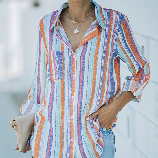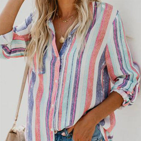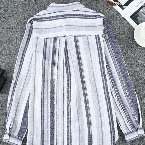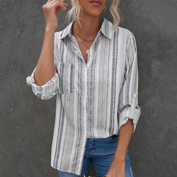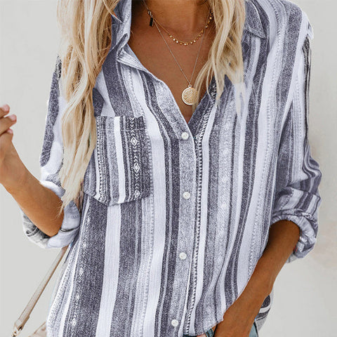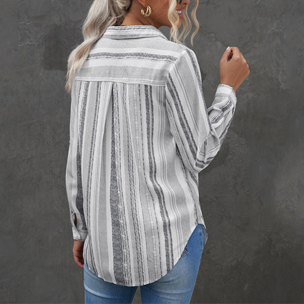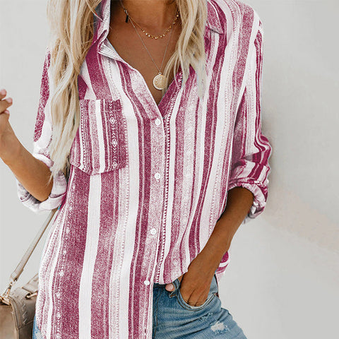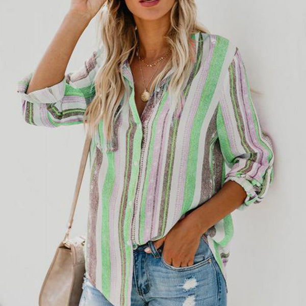 CONCEPTION SPÉCIALE - La conception charmante du revers peut montrer votre décolleté parfait et présenter un look charmant. Les hauts de couleur unie à rayures regorgent d'éléments à la mode. La chemise ample à manches longues et col montant à rayures deviendra votre premier choix au printemps.