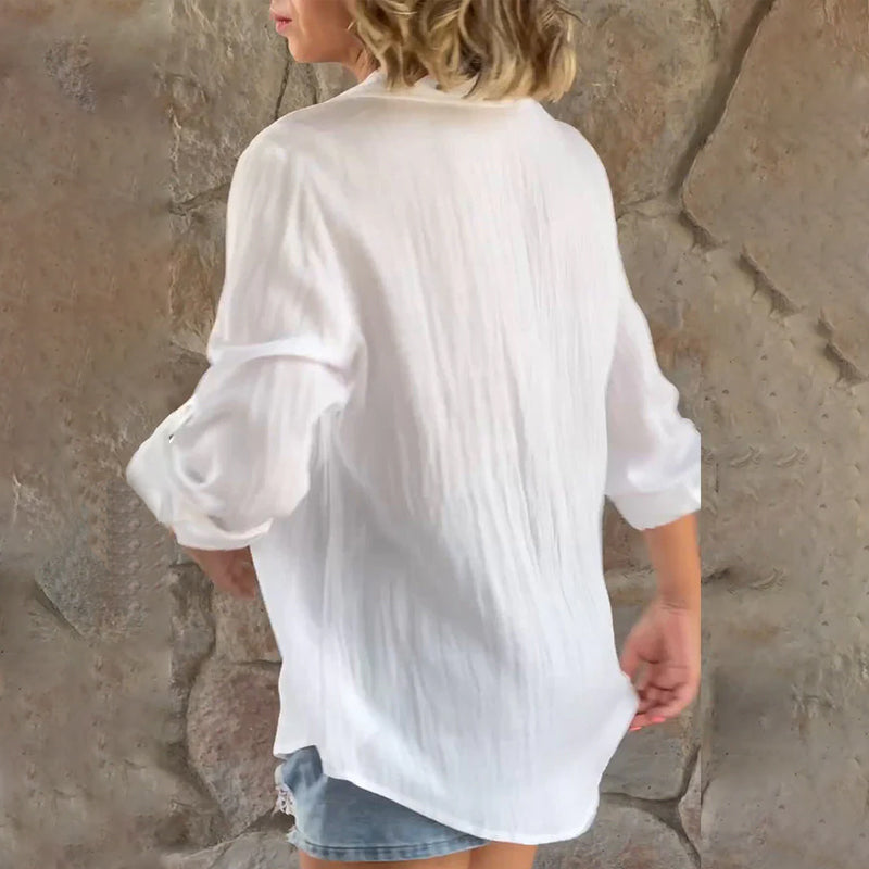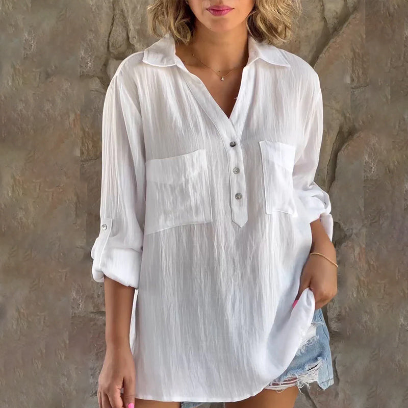 BLOUSE SIMPLE MAIS CHIC - Cette blouse combine un style décontracté avec des détails ludiques. Un charmant décolleté en V fait du chemisier un excellent compagnon sur le canapé ou à d'autres heures agréables. Afin de créer une coupe à la mode, la chemise flatteuse est équipée de quelques boutons fonctionnels frappants, ce qui amplifie l'attitude vintage de cette chemise tendance.