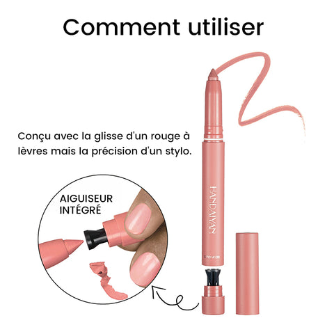 Fonction 2 en 1 - À la fois un crayon à lèvres et un rouge à lèvres, représentant la forme des lèvres tout en appliquant la couleur, répondant à tous les besoins. Un petit dessin a été ajouté en bas, plaçant la pointe du crayon sur le dessus et en la faisant tourner doucement pour lui redonner la forme la plus originale de la pointe, ce qui la rend encore plus facile à utiliser !