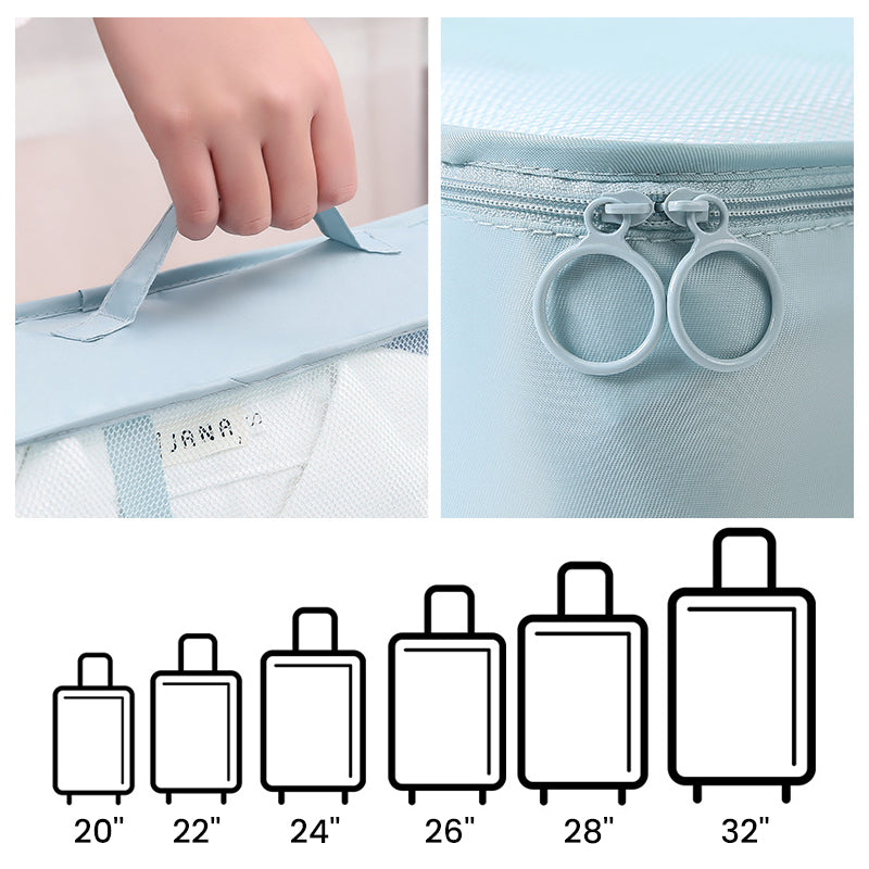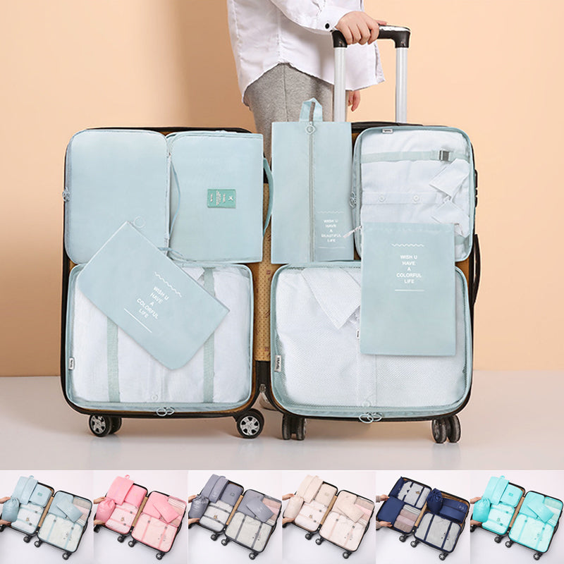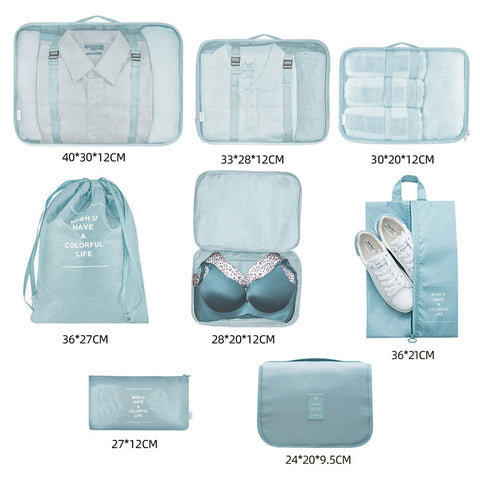 Emballage inclus: 1 x 8 sacs de rangement pliables (3 cubes d'emballage de différentes tailles, 1 sac de sous-vêtements de soutien-gorge, 1 sac à chaussures, 1 trousse de toilette, 1 poche plate, 1 poche à cordon)