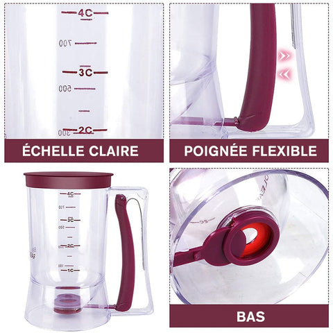 • âœ?Facilité d'utilisation: conçu avec une large ouverture de bouche qui le rend facile à remplir. Manœuvré manuellement, il suffit d'appuyer légèrement sur le guidon, la valve à dégagement rapide quitte la crêpe. La valve de sécurité empêche le distributeur de fuir et garde vos mains et votre cuisine propres.