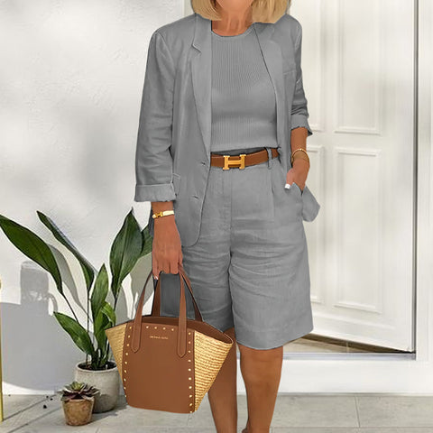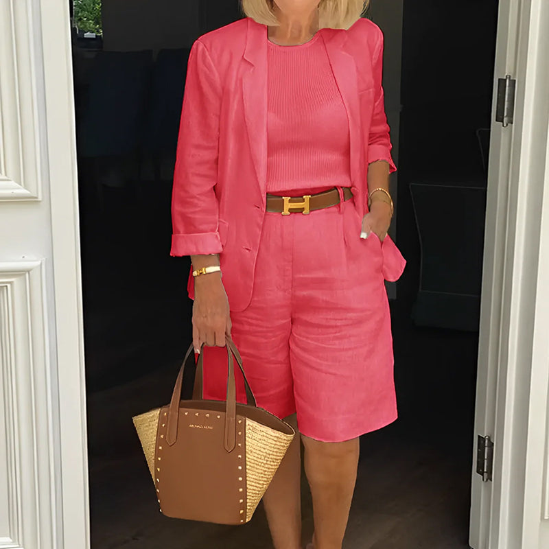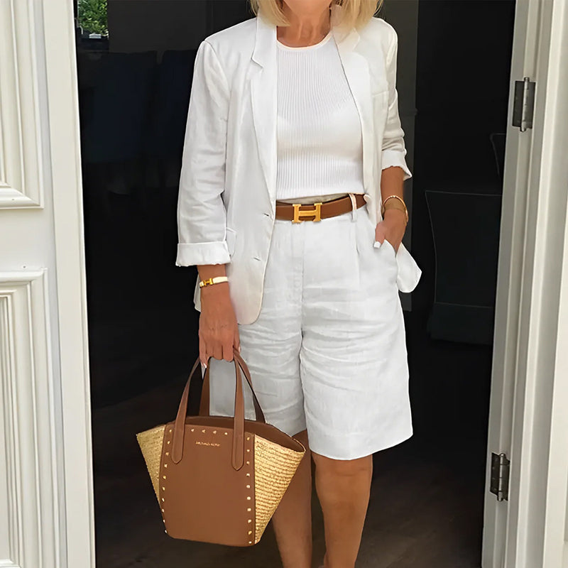Le short assorti est doté d'une taille haute, d'une fermeture éclair à la taille, de poches obliques et d'une jambe droite.