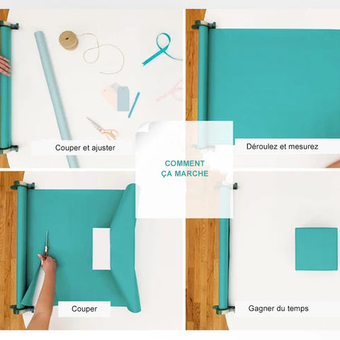 Comment fonctionnent les Wrap Buddies - Fixez simplement la pince à emballage cadeau à n'importe quelle table ou plan de travail, ajustez-la pour s'adapter à N'IMPORTE QUELLE taille de rouleau, déroulez le papier d'emballage cadeau, mesurez et enfin coupez facilement. C'est comme avoir votre propre assistant personnel d'emballage cadeau.