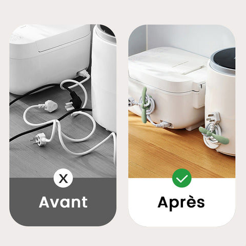 Ce petit organisateur de cordons pour appareils de cuisine maintient les fils en désordre proprement et de manière ordonnée sur les appareils. Non seulement cela empêche l'enchevêtrement des fils lorsque plusieurs machines sont connectées, mais cela élimine également le risque pour la sécurité que la prise devienne humide lorsqu'elle se trouve sur le comptoir de la cuisine.