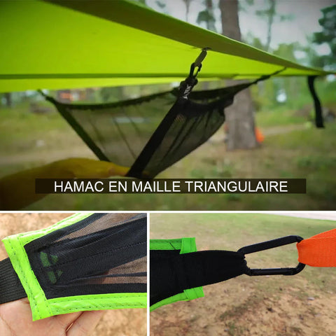 • HAMAC TRIANGULAIRE : Le triangle du hamac à 3 points est suspendu entre 3 points d'ancrage au sol, vous n'avez donc pas à chercher un sol plat. Vous pouvez l'utiliser où vous voulez.