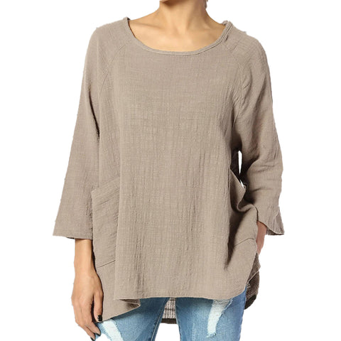 Col rond, manches trois-quarts, ourlet arrondi, couleur unie, coupe ample décontractée, haut tunique avec devant court et dos long. Le look minimaliste s'adapte à toutes les morphologies pour un style confortable et décontracté.