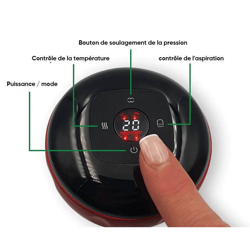 • Massage intelligent - Avec une aspiration de 5 modes différents et 5 niveaux d'intensité, Cupper agit comme votre massothérapeute personnel et adapte un massage à vos propres besoins. Un fonctionnement simple offre un accès rapide aux commandes de bouton et à l'indication d'affichage direct sur le panneau, et a un moyen pratique de surveiller l'état du travail. Allumez / éteignez immédiatement ou réglez le niveau d'intensité du vide comme vous le souhaitez.