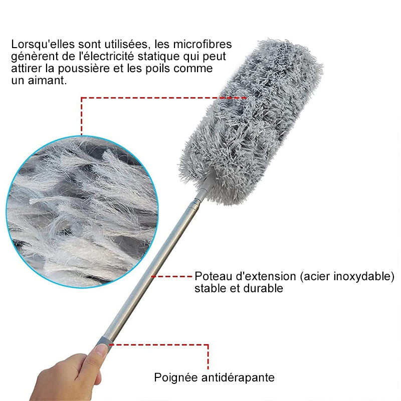 Facilite les travaux ménagers - Grâce à la technologie innovante de séparation des fibres, il est chargé électrostatiquement lors de son utilisation, attirant facilement la poussière, le pollen et les cheveux. Utilisation humide et sèche. Le matériau en microfibre et le dernier processus de production garantissent que le plumeau vous servira mieux, antirouille, solide et durable, léger, adapté aux appareils ménagers, plafonds, stores, ventilateurs de plafond, toutes sortes de meubles et voitures.