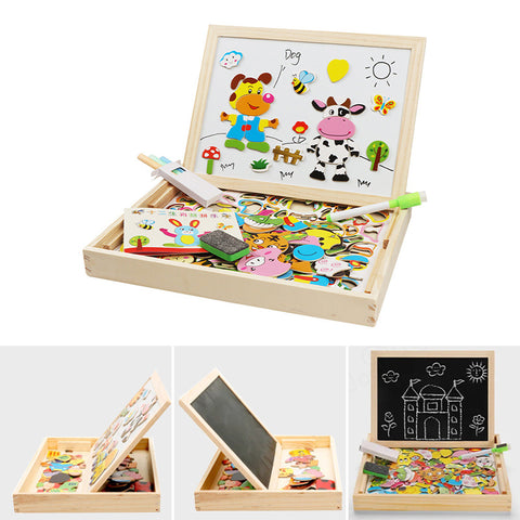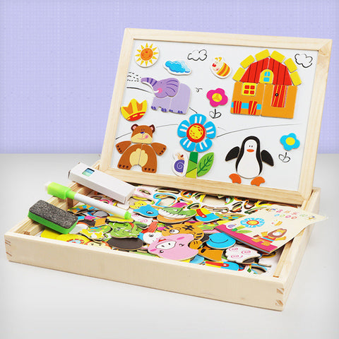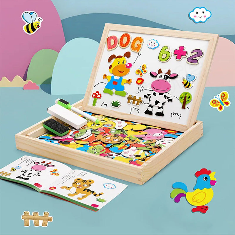 Tableau d'art double face, blanc effaçable à sec et tableau noir. Plus de 100 pièces en bois colorées sur le thème des animaux avec support magnétique complet.