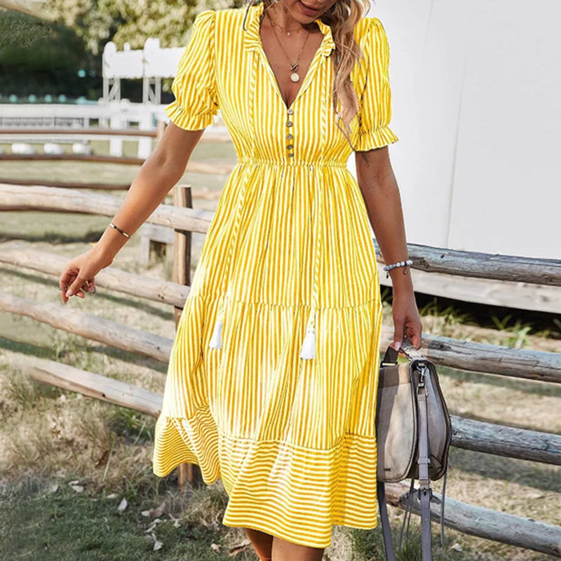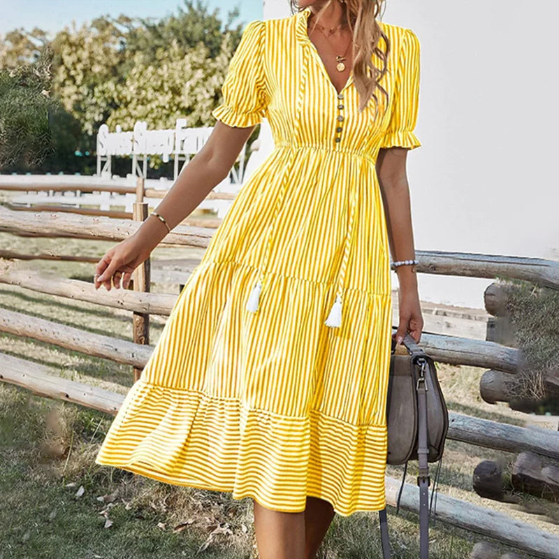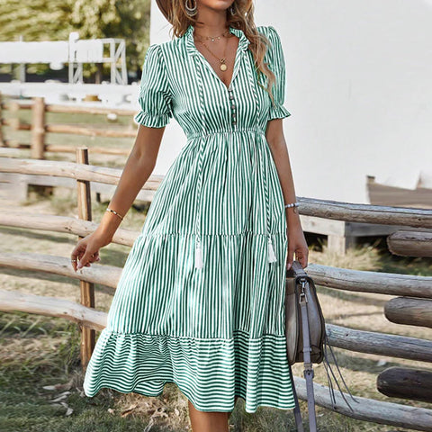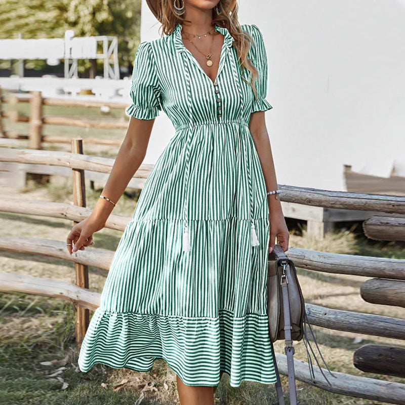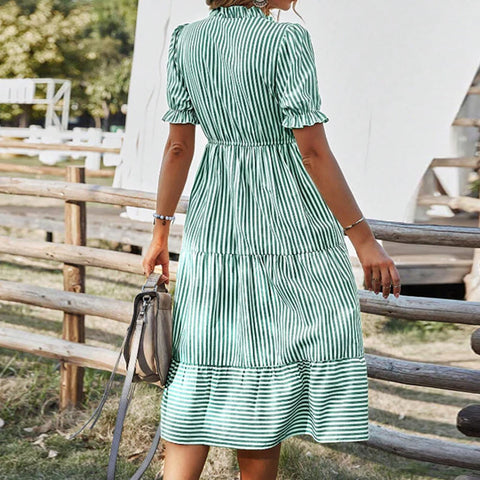 Caractéristiques - Style simple. Chemise habillée tunique boutonnée légère et évasée à coupe ajustée avec manches supérieures pour femmes et filles. Col à revers et chemise à jupe midi à manches courtes, imprimé rayé à simple boutonnage, haut et bas devant et dos, classique et unique