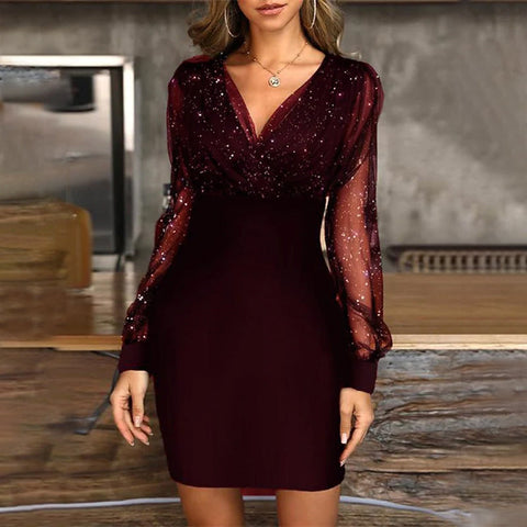Manches longues, V -neck, ourlet divisé, robe longue dans les paillettes.