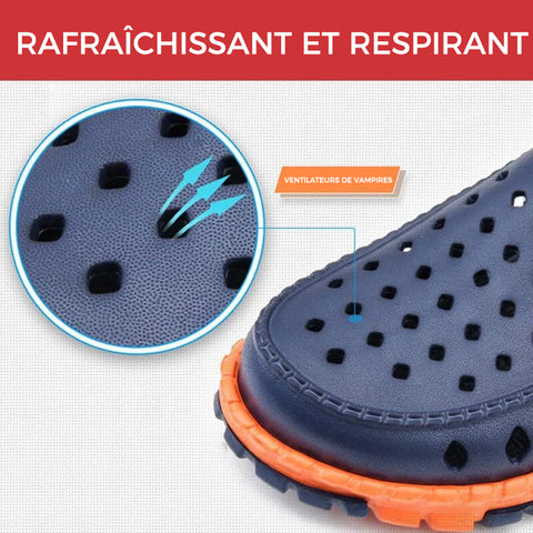 Le large embout rend les pieds moins retenus et la conception de l'empeigne perforée creuse permet à l'humidité de s'évacuer rapidement, rendant la plante des pieds plus sèche et confortable.