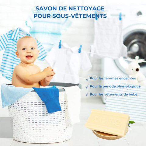 Savon nettoyant pour sous-vêtements: Ce savon a d'excellentes propriétés nettoyantes, éliminant la plupart des taches et laissant un parfum frais et original, parfait pour laver nos sous-vêtements.