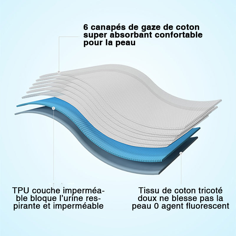 La gaze à 6 couches est super absorbante et contient une couche de TPU et une couche tricotée, ce qui améliore l'absorption et la résistance à l'eau de la culotte. Empêche les fuites d'urine et ne tache pas les draps. Remarque : les pantalons d'apprentissage â‰?les couches doivent être changés lorsque bébé est rappelé.
