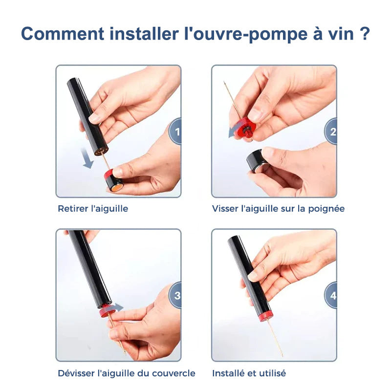• 【Facilité】Le nouvel ouvre-vin à pompe à air est un moyen facile d'ouvrir une bouteille de vin sans tirer et sans se tordre. Il suffit d'insérer l'aiguille, de pomper quelques fois et le bouchon sortira.